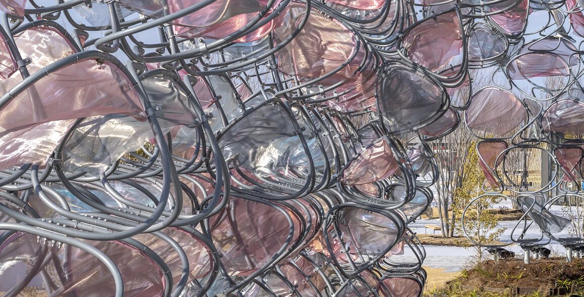 パナソニックパビリオンの外装ファサード(ZAMメッキ鋼管・膜)を当社が施工。