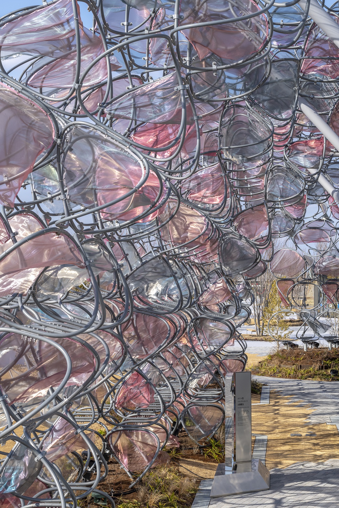 パナソニックパビリオンの外装ファサード(ZAMメッキ鋼管・膜)を当社が施工。